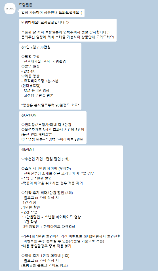르랑필름은 기본 제공 상품부터 너무 좋았어요! 1인 2캠 촬영에, 4K영상촬영이구 추가로 제공해주시는 파일도 정말 많았구요!